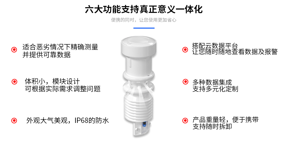 智能一體化小型氣象站無活動部件,功耗小。它是一種集成度高、可靠性高、功耗低、體積輕、安裝速度快的小型氣象站,它可以在各種惡劣的環境中工作,采用熱鍍鋅和靜電噴霧技術進行自我處理。具有較強的耐腐蝕性和抗氧化性。